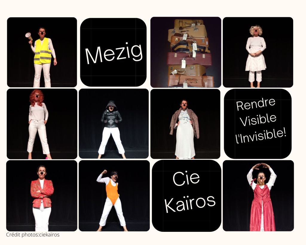 Dans Mezig, la comédienne laisse la parole à son Clown, Houne, qui « Rend visible l’Invisible » en s’emparant joyeusement et viscéralement de ses multiples sous- personnalités (décrites par C.G Jung), celles- là même qui participent à sa Démocratie Intérieure et qui réagissent aux moindres évènements vécus. Chacune, à tour de rôle se fait entendre, se raconte et exprime ses besoins.